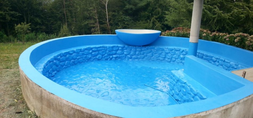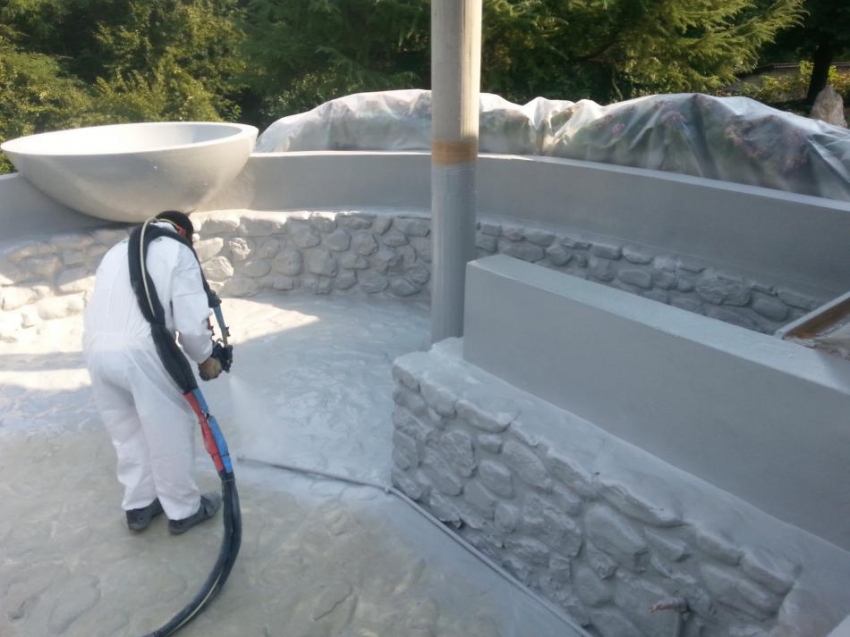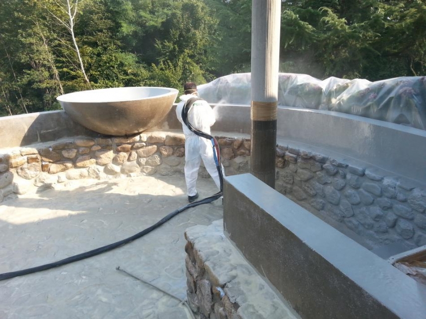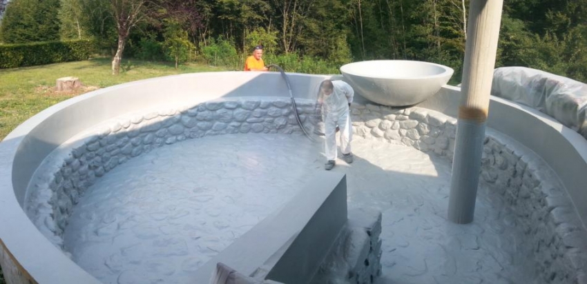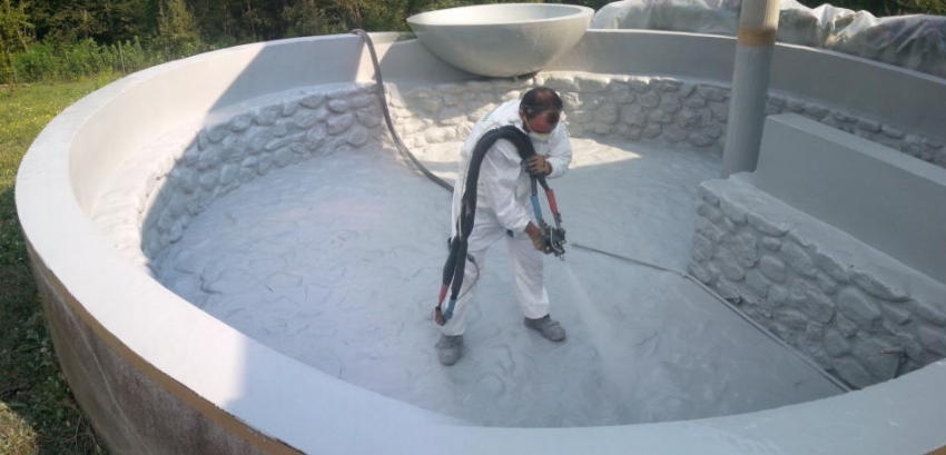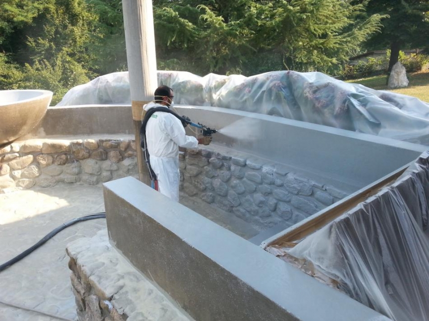 La ditta Poliurtech ha eseguito intervento con sistema a base di poliurea pura applicata a spruzzo per rifacimento impermeabilizzazione vasca da trasformare in piscina, la poliurea ha permesso di creare uno strato continuo impermeabile per la ricopertura della struttura esistente in sasso. La poliurea è stata poi rivestita con apposita vernice per piscina anticloro e antivegetativa.