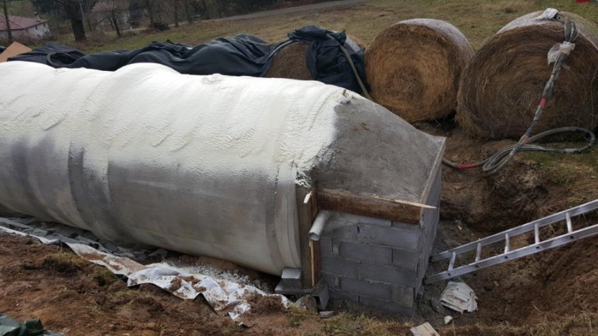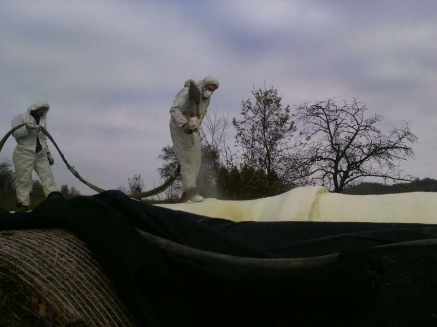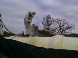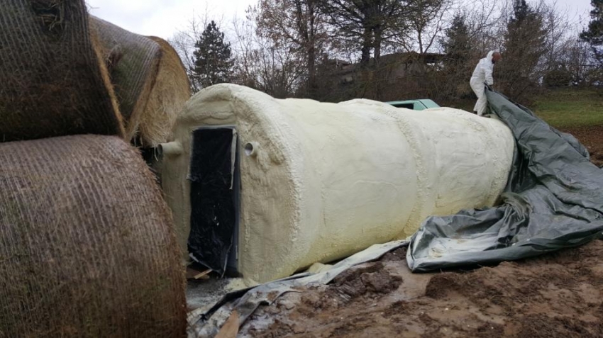 La ditta Poliuyurtech è utilizzato il poliuretano a spruzzo per la coibentazione e isolamento di una cisterna deposito, il poliuretano a spruzzo può essere applicato su strutture cilindriche anche di forme particolari complesse difficili da trattare con pannelli rigidi, il poliuretano a spruzzo ha un ottimo potere isolante; il poliuretano a spruzzo ha permesso di ottenere una superficie pedonabile e impermeabile in pochi minuti, il poliuretano a spruzzo ha regolarizzato e coperto tutte le tubazioni sottostanti.